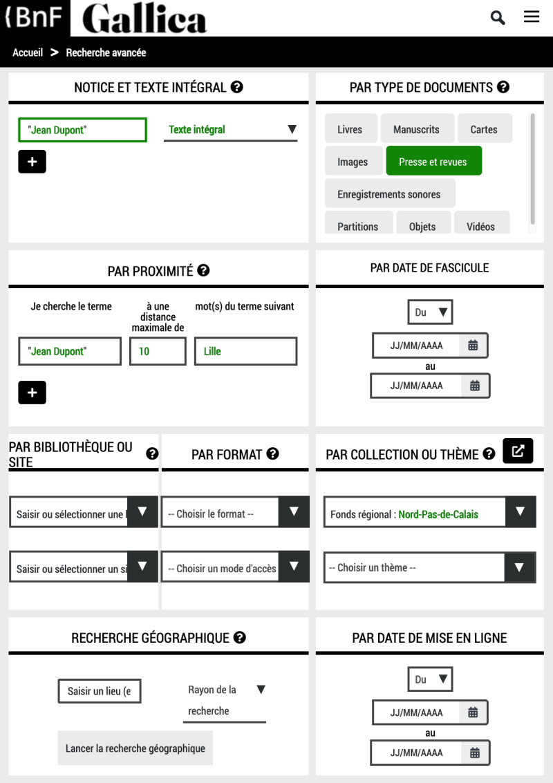 La base. Si vous cherchez Jean Dupont, Gallica vous sortira toutes les pages contenant le mot "Jean" ET le mot "Dupont", même s'ils sont à deux pages d'écart. Pour chercher l'expression exacte, utilisez les guillemets : "Jean Dupont".