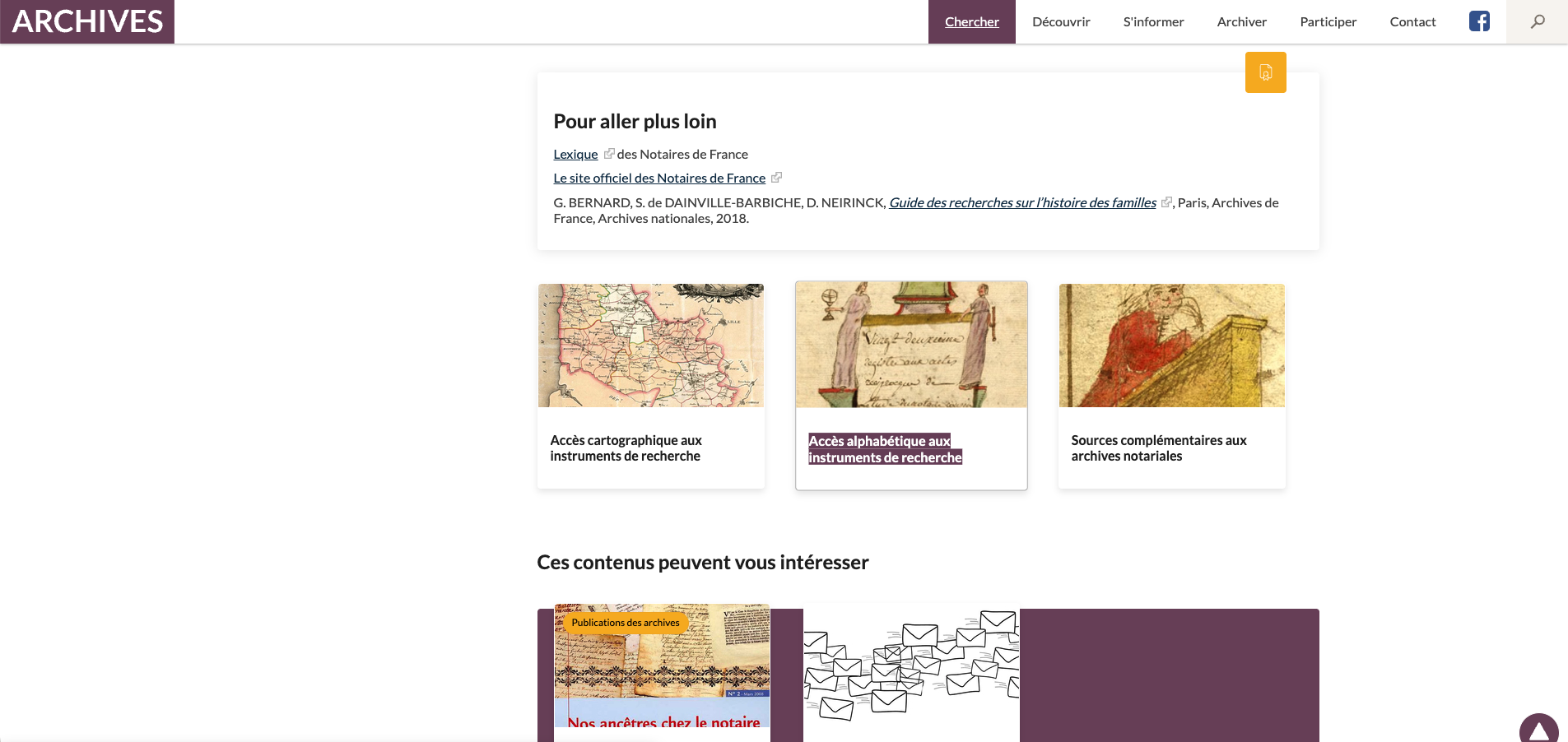 - Chercher (en bas de la page) la rubrique "Accès aux instruments de recherches".