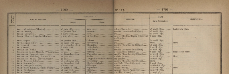 - La Source Principale : Le Bulletin des Lois L'État français a publié la liste de toutes les personnes ayant opté dans 38 volumes du Bulletin des lois de la République française entre 1872 et 1873. C'est la source de référence. Ces listes sont généralement classées par arrondissement puis par canton d'origine.