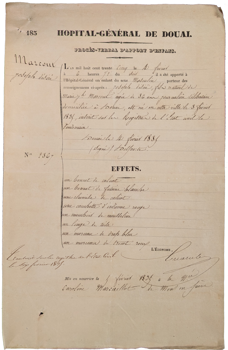 - Le procès-verbal de découverte ou le rapport sur les circonstances de l'abandon. C'est ici qu'on peut trouver des détails cruciaux : un morceau de tissu, un bijou, une image pieuse, un mot manuscrit...