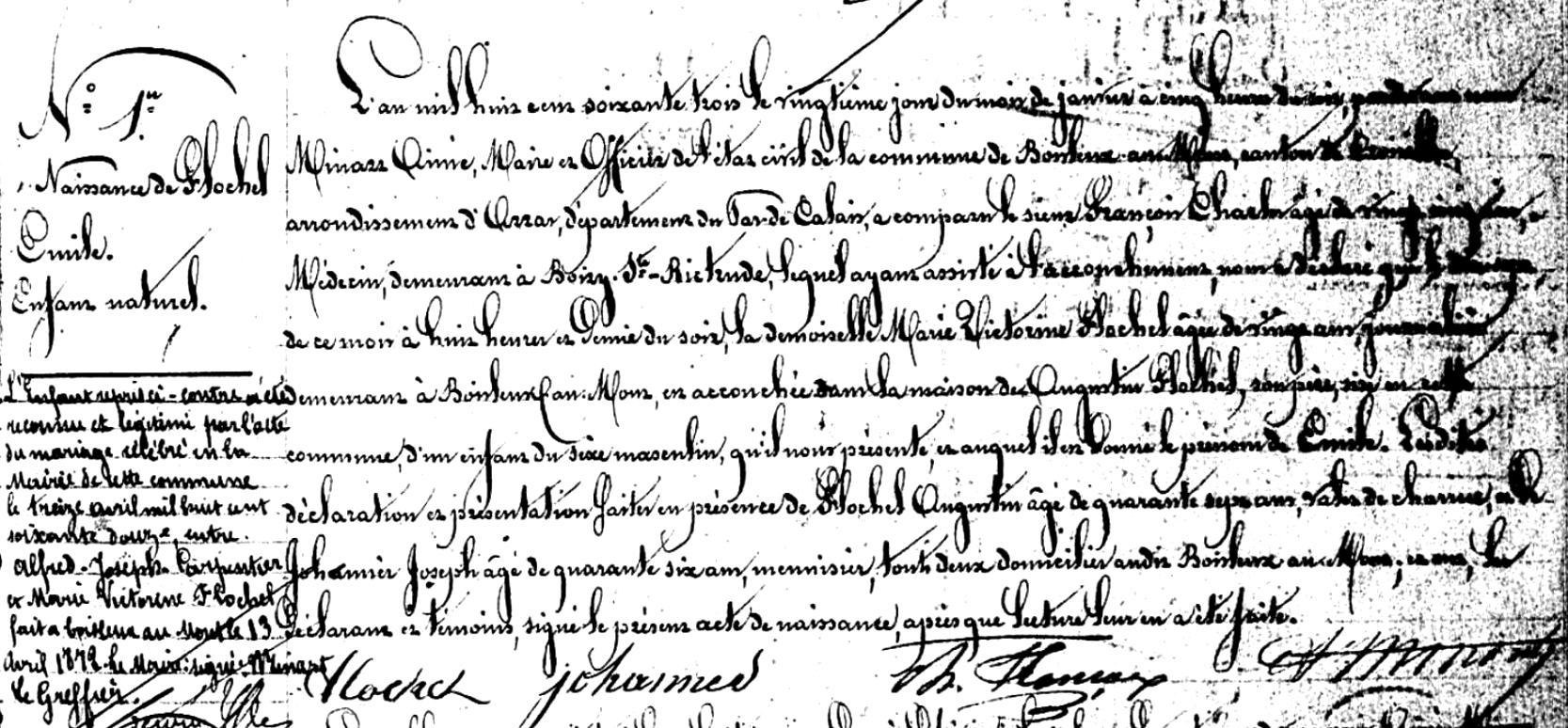 Le recensement indique une naissance vers 1863 à Boisleux-au-Mont. Forts de cette information, nous fonçons vers les archives du Pas-de-Calais pour récupérer son acte de naissance. Et là, c'est l'impasse. Aucun Emile Carpentier n'est né à Boisleux-au-Mont en 1863, ni en 1862, ni en 1864. Avons-nous fait fausse route ?