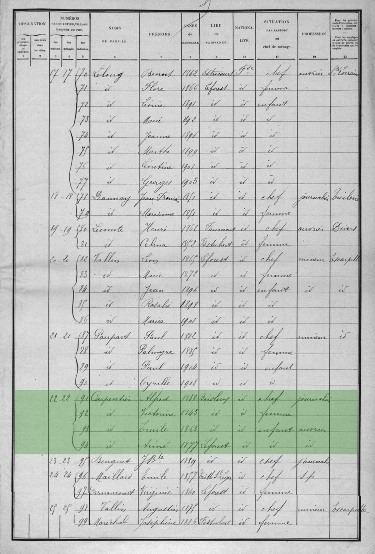 Notre enquête commence par une "photographie" administrative de l'époque : le Recensement de 1921 (R) de Leforest. En parcourant les rues de Leforest, nous tombons sur le foyer d'un certain Emile Carpentier et de son épouse, Laure Carpentier (qui ne mentionne pas son nom de naissance !), dans la rue du Jourdain (actuelle rue Victor Hugo). Il a alors 58 ans. Il n'est plus le jeune garçon d'autrefois. C'est un homme mûr, marqué par la vie, qui exerce la profession de Chaudronnier à l’usine de Produits Chimiques d’Auby.