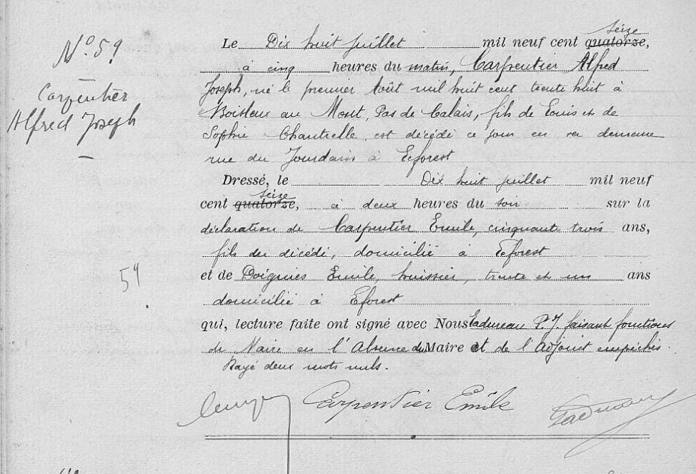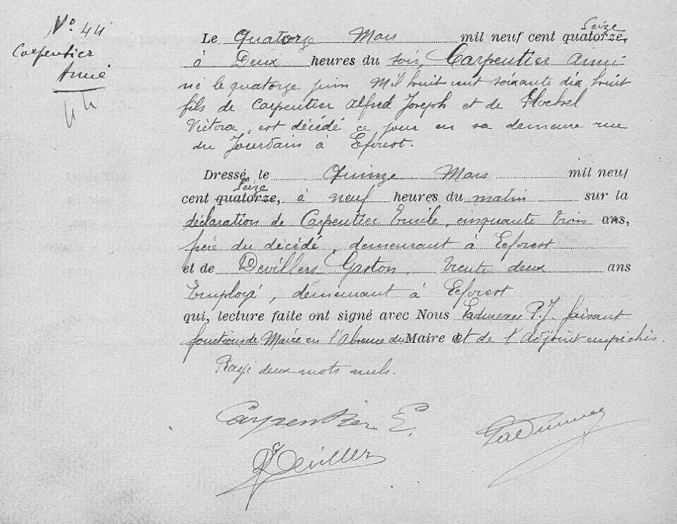 En consultant les actes, l'histoire devient poignante. Ils sont tous décédés en l'espace de 18 mois, pendant l'occupation allemande. Et à chaque fois, le déclarant est le même : "Emile Carpentier, fils du défunt" ou "frère du défunt".