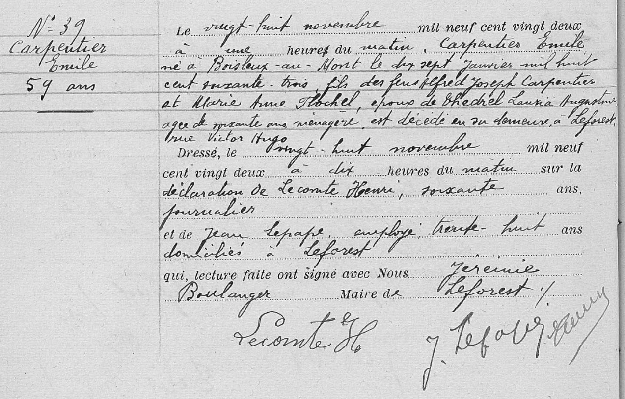Cette lumière retrouvée auprès de Lauria sera malheureusement brève. Notre enquête se termine sur une date fatidique : le 28 novembre 1922. Emile s'éteint ce jour-là à Leforest, à l'âge de 59 ans. Au moment où j'écris ces lignes, cela fait 103 ans jour pour jour qu'Emile a tiré sa révérence.