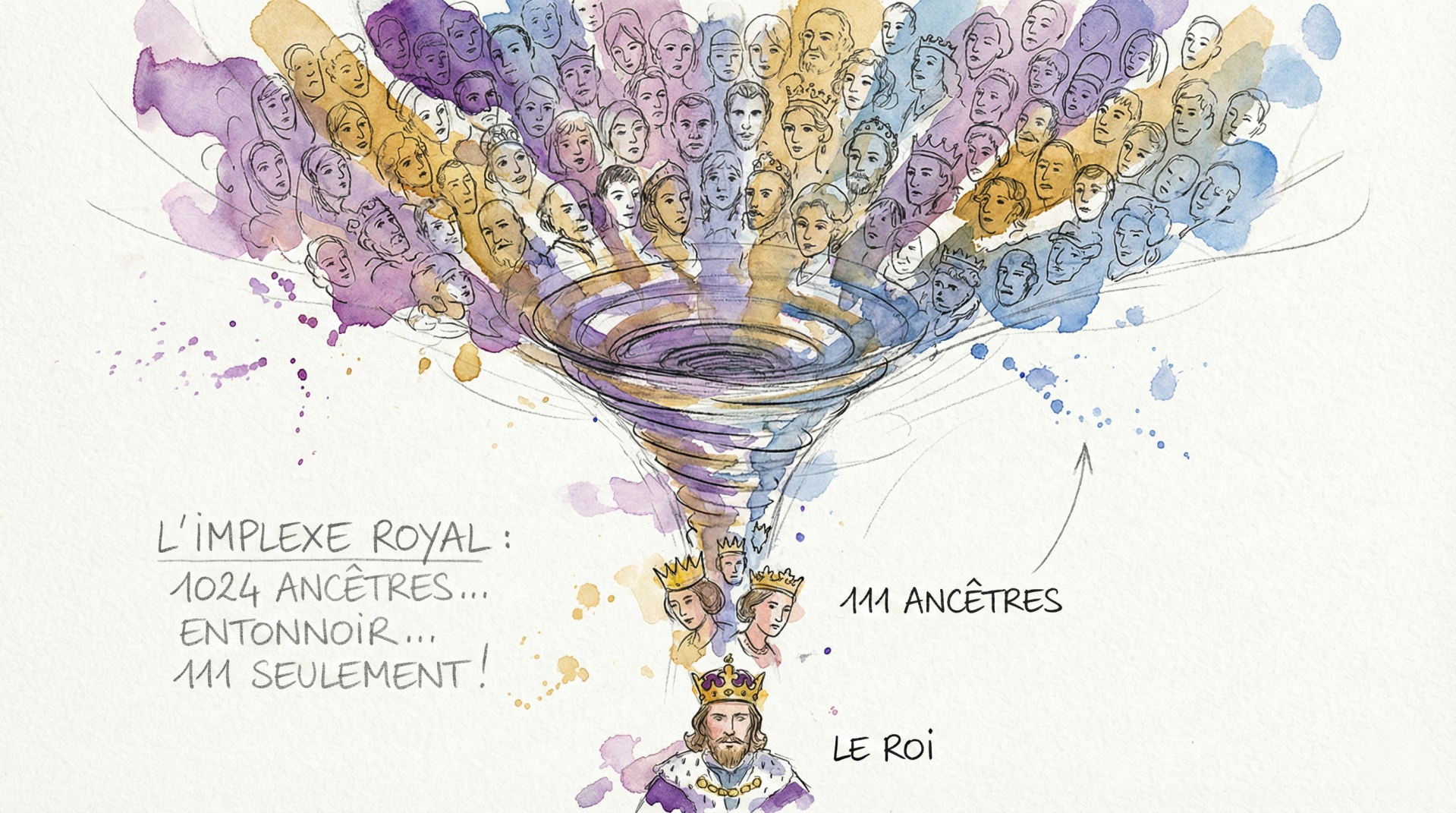 L'implexe, c'est la réalité qui vient corriger la théorie. Cela signifie simplement qu'un même ancêtre apparaît à plusieurs endroits différents dans mon arbre. En clair : mes ancêtres se sont mariés entre cousins. Dans nos campagnes d'autrefois, on ne voyageait pas. On naissait, on vivait et on mourait dans un rayon de 10 km. Forcément, au bout de quelques siècles, tout le village était apparenté. En épousant la voisine, on épousait sans le savoir une cousine éloignée. L'exemple le plus célèbre est celui du roi Alphonse XIII d'Espagne. À la 11e génération, au lieu d'avoir 1 024 ancêtres différents, il n'en avait que 111 ! À cause des mariages consanguins des familles royales, son arbre généalogique était un véritable entonnoir. Ce phénomène existe aussi, à moindre échelle, chez tous nos ancêtres paysans.
